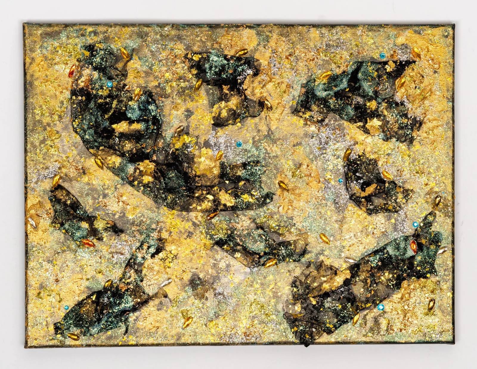 Acrylic, glitter medium, and black lace embedded with foil and rhinestones on black canvas